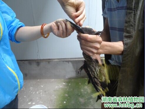 2014年8月16日,浏阳市森林公安送来一只鸟到湖南省野生动物救护中心(简称“中心”)救护。该鸟是浏阳市枨冲镇市民在该镇山冲购买,送交浏阳市森林公安。“中心”工作人员辨认该鸟确定为国家II级保护动物海南虎斑鳽,精神状况不佳,可能由于饥饿及脱水所致。“中心”工作人员立即对海南虎斑鳽进行了补液等相应的救护措施,待其身体状况恢复正常,具备野外生存能力后,选择合适地点放归大自然。