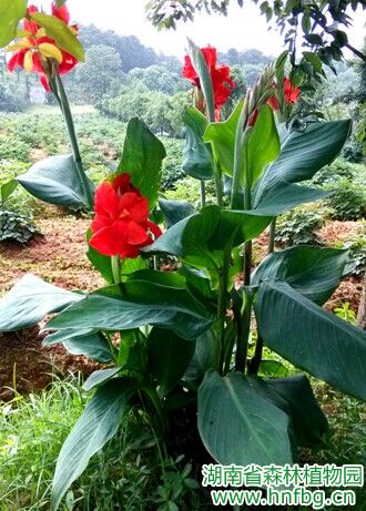 美人蕉(学名:Canna indica L.),多年生草本植物,单叶互生,叶片卵状长圆形。总状花序,花冠大多红色,花、果期3-12月。