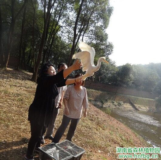 2014年10月8日下午,在植物园风景秀丽的鸳鸯湖畔对19只鹭鸟进行了放生。该批鹭鸟是2014年9月23日经炎陵县森林公安局查获后送中心救护的,其中有1只中白鹭、12只池鹭、5只牛背鹭、1只斑头鸺鹠。经过中心工作人员精心护理后,进行了放生,它们展翅飞向了大自然的怀抱。