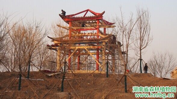 第三届中国绿化博览会湖南园经过2个月时间施工,我项目部克服了大风、严寒、冰冻等不利天气,已完成塑石景观、水体基础、驳岸景观、地形塑造及部分大树栽植等工程,目前,已进入湖南园最关键性节点工程---景观亭、水榭廊的施工。为了使湖南园景观亭与实景相似度更高、更能体现湖湘文化特色、积极打造精品工程,同时,也为了降低施工成本、加快工程进度。经请示并组委会批准同意,将景观亭和水榭廊原来主体混凝土结构全部改为木质结构,由株洲一家有实力的、专门生产木质景观亭的工厂生产,主体构件在工厂制作完成。预期木质景观亭、水榭廊现场安装工程将于12月底全部完工。