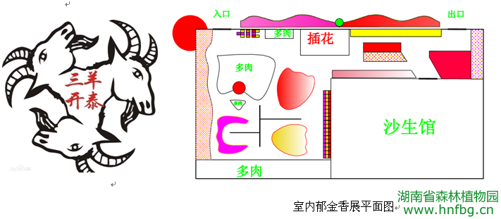 古语有“三羊开泰”之说,本应作“三阳开泰”,指冬去春来,阴消阳长,是吉利之象征。本次室内郁金香展主景是抽象的“三羊开泰”平面图:三只大羊聚立于一处。两只羊头形状柔化为花瓣状,另一只以羊角代之,以各色郁金香填充形成“三羊开泰”,取其美好寓意。