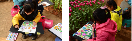 来自童画美术教育中心的孩子们在实景参观梅花、茶花、郁金香花展后,用自己的画作描画了他们心中美丽的植物园,也以此拉开了“冬之韵”系列活动的序幕。