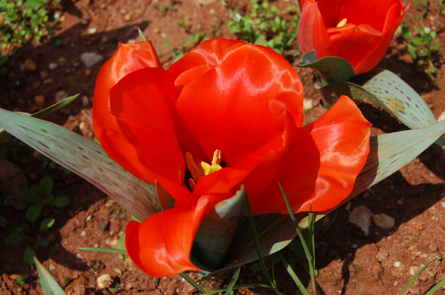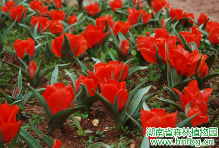 今年植物园引进了一个特大花郁金香品种‘Giant Orange Sunrise’(橘色日出),种植在北门郁金香品种园,这也是国内首次引进该种。它的花是靓丽浓郁的橙红色,花瓣比其他品种厚实,有着天鹅绒一样的光泽,令人着迷。花的直径超过16cm,比以前见到的郁金香花都要大哦。但是它实在有些“敦实”,几乎贴着地开出花来,身高才不到20cm,乍看过去,让人以为它是做工完美的假花呢。