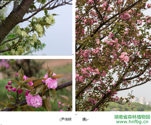 在湖南省森林植物园“春之歌”世界名花展的舞台上,广受公众喜爱的是樱花系列演出。染井吉野樱轰轰烈烈开放了十天后,一场春风春雨悄然为其拉上了的落幕,五颜六色的重瓣樱花随即盛妆登台,靓丽整个植物园。园里的重瓣樱花主要分布在蝴蝶谷两边,樱花大道沿线的樱花品种园里。从外观颜色来看,大致有粉色、红色和绿色。粉色的有一叶、八重红大岛等品种,红色的有红叶樱、关山等品种,绿色的有郁金。相比染井吉野樱,重瓣樱花颜色更加艳丽,花片大而重叠,虽是花叶齐开,但花开到最盛时,一树繁花可将叶子都遮住,其花团锦簇的外貌特征与大众丰盈、喜庆的审美观更相契合,因此深受广大游客的喜爱。