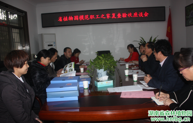 2015年11月19日,湖南省直工会副主席彭福喜一行三人在湖南省林业厅联合工会副主席王传洁的陪同下,对我园省级模范职工之家工作开展和建设情况进行了复查验收。我园副主任郑焱、工会副主席喻尚平、曾德连及园工会人员参加了会议。