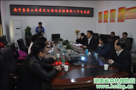 在随后的座谈会上,李林山主任结合PPT演示向客人们详细介绍了我园在物种保存、科学研究、科普教育、生态旅游和开发利用等方面的情况,并着重指出了我园近几年在打造“全国有位置,世界有特色”的一流植物园的过程中所取得的成绩和积累的经验。同时,他表示在植物园发展的过程中,还存在着许多问题和不足,南宁青秀山风景区创建5A级景区的成功经验非常值得我园学习借鉴。