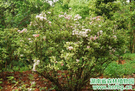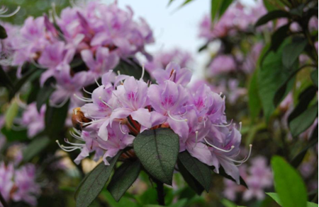 ),杜鹃花科常绿灌木,伞形花序顶生,花紫红色,有花多达10朵以上,花期4~5月,是值得推广的一种杜鹃花原种。观赏地点:西门杜鹃园。