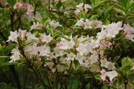 ‘Variegata’),忍冬科锦带花属落叶灌木,叶缘乳黄色或白色,花粉色,开花时花团锦簇、极其繁茂,花期4~6月,是花叶共赏的优良园艺品种。观赏地点:动物园路沿线。