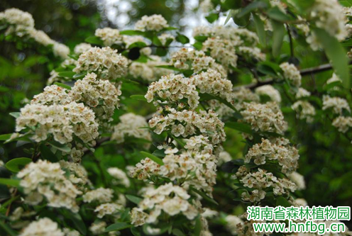 植物园里有几种花灌木,每到四月中旬便在枝头开满洁白密集的花朵,有如白雪覆盖,清新美丽,观之让人宁静而欢喜。这场白色花宴里有六月雪、火棘、小蜡等等。