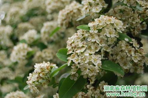 )是蔷薇科火棘属的常绿灌木,高可达3米。花期4~5月,复伞房花序上有小花数十朵,花白色,径约1cm。果9~10月成熟,红色球形果一串串挂在枝头,可观赏两三个月,是一种极好的春季看花、冬季观果的植物,同样也可以制作盆景。