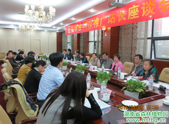 2016年4月25日,湖南省林业科技推广总站在长沙组织召开了全省市州林业科技推广站长座谈会。省林业科技推广总站夏艳萍站长、周柏青副站长、蒋胜铎副站长、省林学会熊四清秘书长、省植物园刘玮副主任出席了会议,省林科院、省环境生物职业技术学院和省植物园的科管处长,各市、州林业局推广站长参加了会议。会议由省林业科技推广总站周柏青副站长主持。