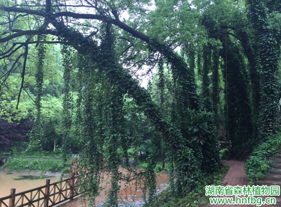 走近省森林植物园玫瑰园与荫生植物园的交汇处,你会看到一道道绿色的瀑布在微风中荡漾,仿佛层层珠帘挂在树梢,又如串串翡翠从天而降,青树翠蔓,蒙络摇缀,参差披拂。此情此景,让人恍若置身于世外桃源,美不胜收。