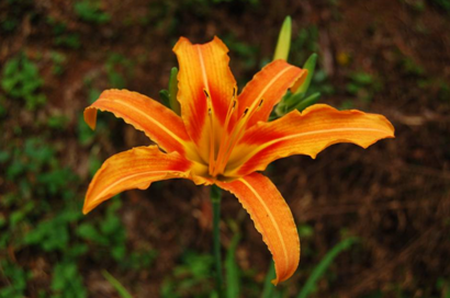)是百合科萱草属宿根植物,叶基生成丛,二列带状,花期6~7月,花无香味,桔红色至桔黄色,花瓣上有V字形斑纹。