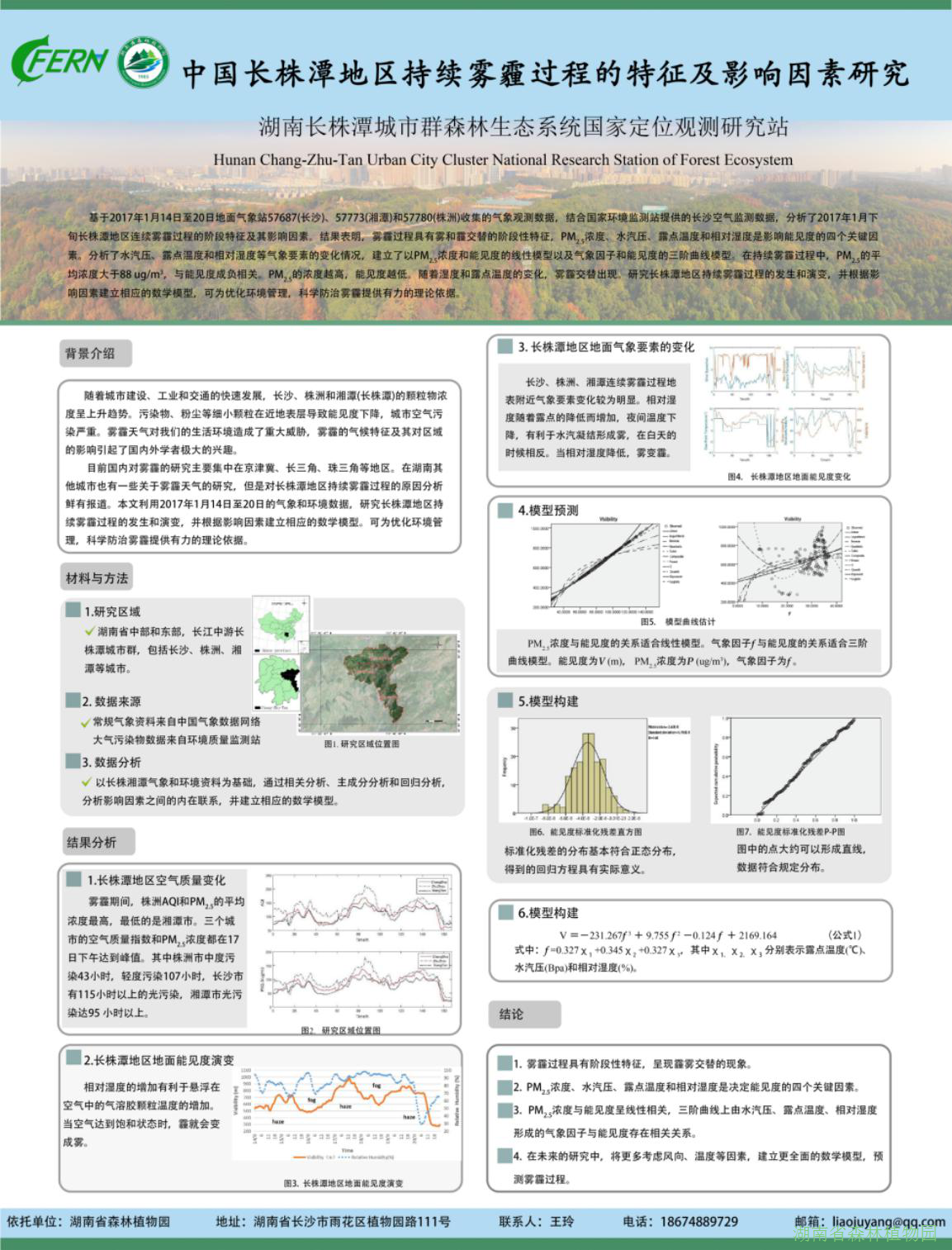 该研究基于2017年1月14日至20日地面气象站57687(长沙)、57773(湘潭)和57780(株洲)收集的气象观测数据,结合国家环境监测站长沙空气监测数据,分析了2017年1月下旬长株潭地区持续雾霾过程的阶段特征及其影响因素。结果表明,雾霾过程具有雾和霾交替的阶段性特征,PM2.5浓度、水汽压、露点温度和相对湿度是影响能见度的四个关键因素。分析了水汽压、露点温度和相对湿度等气象要素的变化情况,建立了以PM2.5浓度和能见度的线性模型以及气象因子和能见度的三阶曲线模型。在持续雾霾过程中,PM2.5的平均浓度大于88 ug/m3,与能见度成负相关。PM2.5的浓度越高,能见度越低。随着湿度和露点温度的变化,雾霾交替出现。研究长株潭地区持续雾霾过程的发生和演变,并根据影响因素建立相应的数学模型,可为优化环境管理,科学防治雾霾提供有力的理论依据。该研究成果发表在SCI收录刊物《Applied Ecology and Environment Reasearch》。