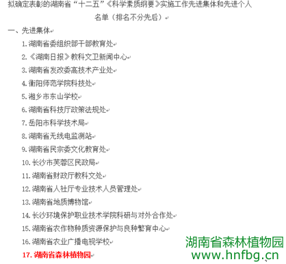 根据《湖南省科协等9部门关于联合开展全省“十二五”〈科学素质纲要〉实施工作先进集体和先进个人评选表彰工作的通知》(湘科协发〔2016〕5号),经省直有关部门单位和各市州申报推荐,省科学素质纲要办组织评审,省科协、省委组织部、省委宣传部、省发改委、省教育厅、省科技厅、省财政厅、省人社厅、省农委拟确定表彰一批湖南省“十二五”《科学素质纲要》实施工作先进集体和先进个人。评出湖南省森林植物园等50家单位获先进集体,50位获先进个人荣誉。
