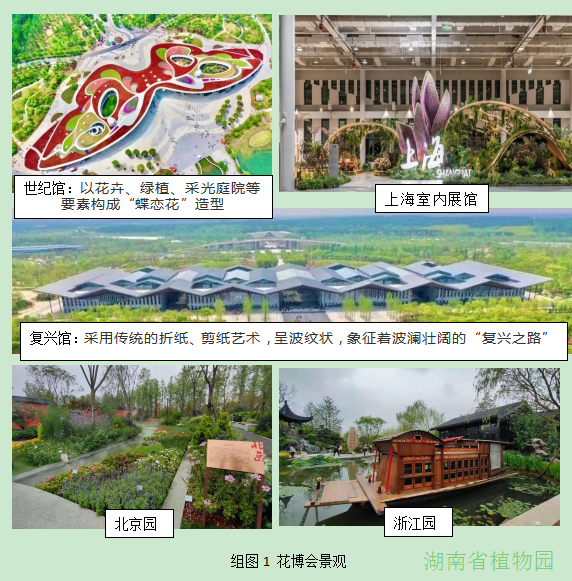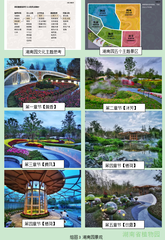 湖南展园第一章节【佩香】取自《楚辞》中“扈江离与辟芷兮,纫秋兰以为佩”,是用植物立体花墙为表现形式,结合现代艺术展示的花冠,就是女子头上戴花的意思。第二章节【沐芳】取自《楚辞》中“浴兰汤兮沐芳,华采衣兮若英”。此区包括两个部分,花瀑浴池和香草花境。第一个部分是用鲜花瀑布营造私密的香花浴池,在此沐浴花的芬芳,让人神清气爽、健康长寿。第二个部分是香草花径,我们湖南园采用了两百多种植物,其中近一百种植物在我们的香草花境。第三章节【腾凤】取自《楚辞》中“吾令凤鸟飞腾兮,继之以日夜”。我们用大地展现凤凰的身体,用艺术护栏组成翅膀,结合彩叶草五彩斑斓的凤羽,艺术表达湖湘大地的空灵婉转,以及经济的腾飞。第四章节【栖荷】取自《楚辞》中“筑室兮水中,葺之兮荷盖”。主体景观建筑取名远香坞,来自周敦颐的《爱莲说》,“濯清涟而不妖,中通外直、不蔓不枝、香远溢清,亭亭净植”。建筑以荷叶造型做屋顶,滚落露珠为坐榻。荷叶叶柄里面栽植了湖南特色的湘妃竹,外围展示了100种湖南特色花卉植物。前面的水体洞庭湖是展园中心。水中荷花和睡莲盛开,近看可以领略“芙蓉国里尽朝晖”的美景,远看连绵起伏的山丘,体现了湖南特色的地形地貌,遥望洞庭山水翠。第五章节【饮露】取自《楚辞》中“朝饮木兰之坠露兮,夕餐秋菊之落英”。此区配置的十二个露珠,营造的意境是以花草为食,晨露为饮,人与自然和谐共存的生活场景。此处的夜景更是晶莹剔透,星光璀璨,让人流连忘返,舍不得离开。