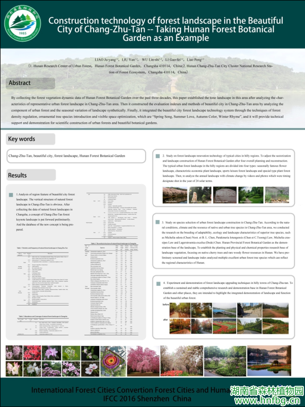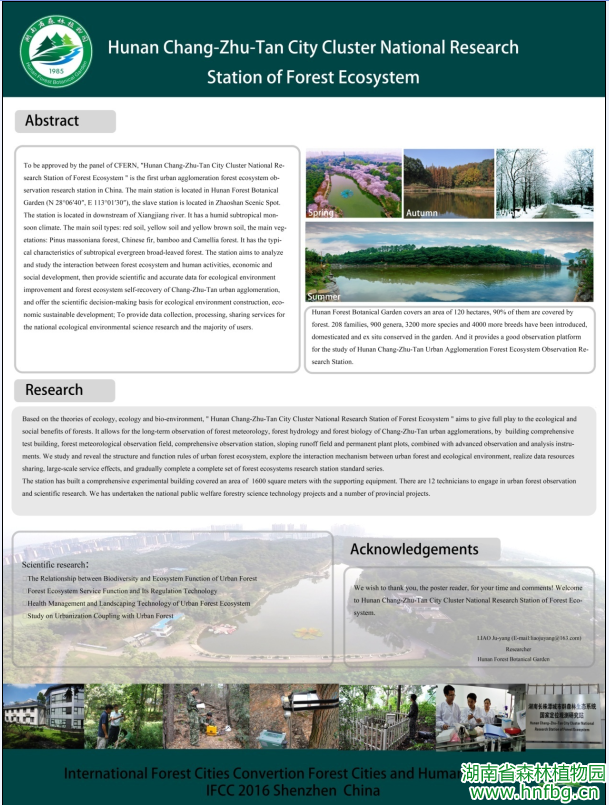 本次会议围绕“森林城市与人居环境”主题,就城市化与森林城市、城市森林与生态系统服务、森林城市规划与区域可持续发展等议题展开研讨。我园以“湖南长株潭城市群森林生态系统国家定位观测研究站”和“长株潭美丽城镇森林景观构建技术研究——以湖南省森林植物园为例”两个主题进行了墙报交流。会议通过了《首届国际森林城市大会深圳宣言》。