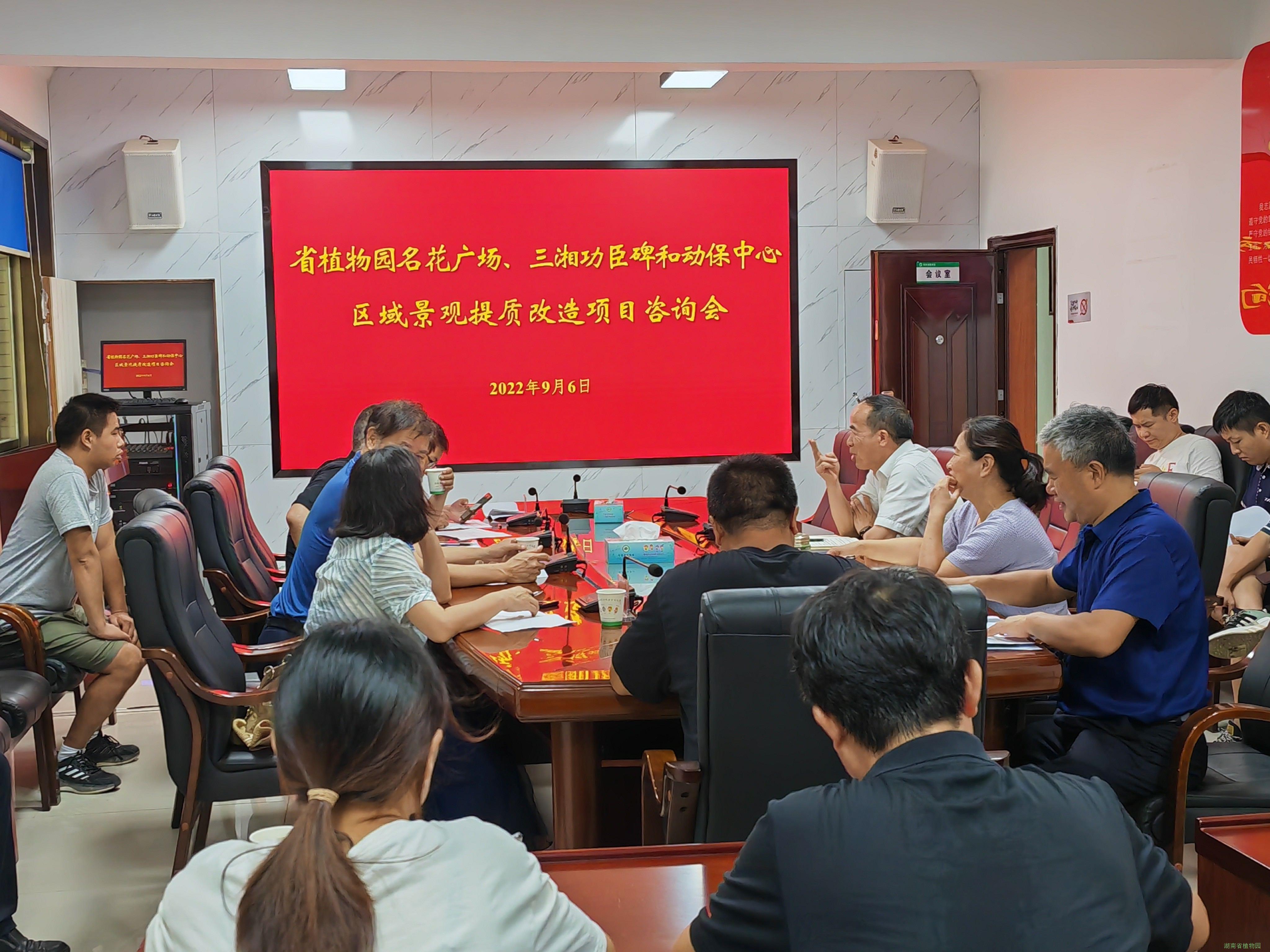 2022年9月6日上午8时30分,湖南省植物园名花广场、三湘功臣碑、动保中心区域景观提质改造项目咨询会于办公楼会议室召开,会议由湖南省植物园党委书记刘玮主持,参加会议的专家有湖南建科园林有限公司陈琼琳、湖南省农业大学园林园艺学院龙岳林、长沙市规划勘测设计研究院廖艳红、中南林业科技大学李家湘。园副主任胡俊东及园各相关职能部门出席会议。