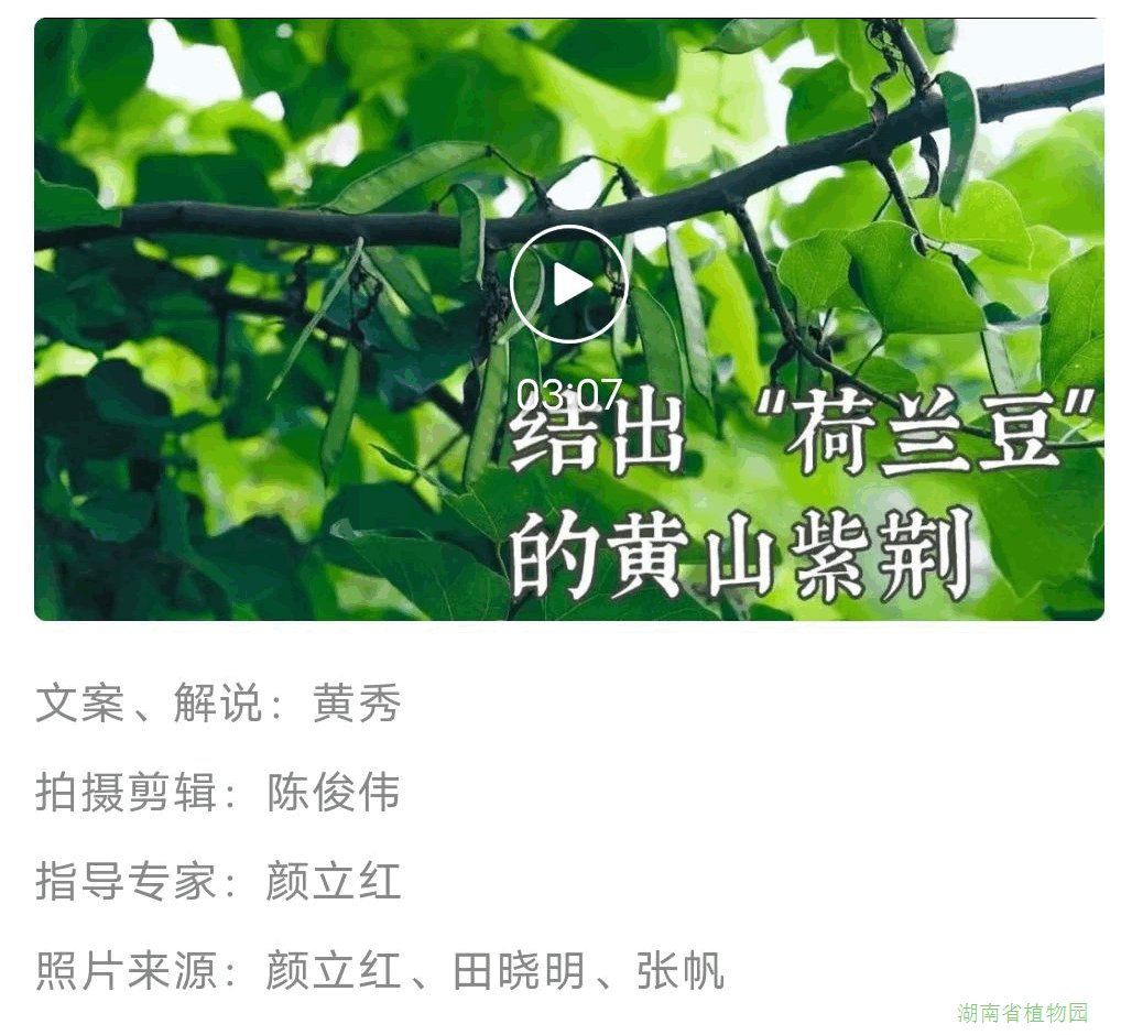 该科普微视频是全网首次详细介绍黄山紫荆在湖南的发现、研究与应用。视频以果实形似“荷兰豆”为切入点,引出本土植物“黄山紫荆”,介绍了它的生长习性与形态特点,又通过与它的亲戚“紫荆”进行叶、花、果比较,加深对它的认识。