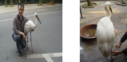 2011年11月13日下午,娄底市双峰县林业局森保站站长向玉习送来一只白鹤寻求救护。这只白鹤系双峰县杏马铺镇高岗村小学生刘亮阁在水库边发现的,碰巧当时该村在县审计局当局长的谢永红回家探亲,于是谢将此事告知了县林业局局长王建国,王局长随即安排有关人员将白鹤送到我“中心”进行救护。中心工作人员对白鹤做了细致的检查,发现它右脚受伤流血较多且精神状况不佳,工作人员对白鹤伤进行了妥善处理并喂食了口服补液盐和葡萄糖以及泥鳅,该白鹤由于伤势较重,能否康复还有待努力。