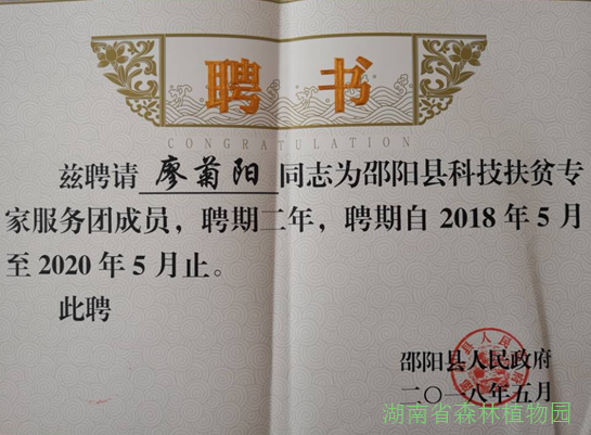 9月29日,邵阳县科技扶贫专家服务团成立暨科技扶贫工作推进会在邵阳县政府会议室顺利召开。邵阳县主要领导出席会议,省、市、县科技特派员、省派驻邵阳县“三区”科技人才、企业代表及各有关部门单位、我园科技人员获邀参加了本次会议,园生态景观所廖菊阳研究员获聘邵阳县科技扶贫专家。
