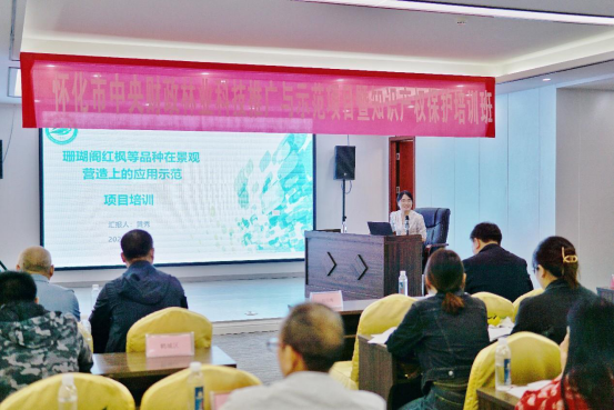 培训班上,2022年中央财政林业科技推广项目《冬红良种推广与示范》《珊瑚阁红枫等品种在景观营造上的应用示范》两个项目的主持人做培训汇报,分别从专业的角度并结合项目工作实际,向大家介绍了良种‘冬红’相关的栽培技术及‘珊瑚阁’红枫等六个优良品种的树种来源、品种简介、景观营造技术等,并对大家提出的疑问进行了解答。(撰稿/唐伯舜 编辑/余帆 编审/周岚)