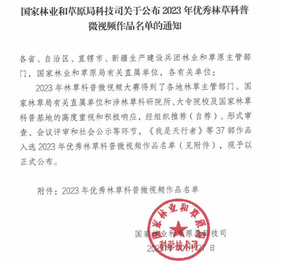 近年来,我园通过开展丰富多样的科普活动,向公众普及林草科学知识,调动公众学科学的积极性。此次微视频的成功入选,是我园在科普宣传工作中取得的又一成果,下一步我园将持续推进林草科普工作,创作更高质量水平的科普作品,为提升全民科学素质,更好推动林草高质量发展贡献力量。(撰稿/王征 编辑/余帆 编审/周岚)