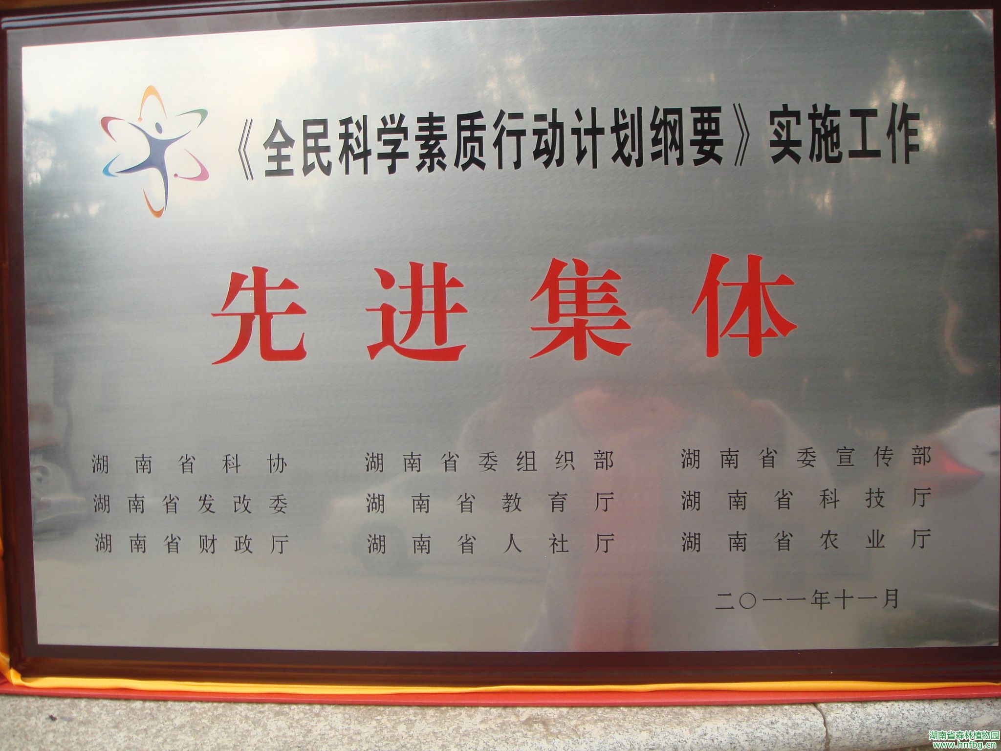 2011年11月30日荣获了省委组织部、省委宣传部、省科协、省发改委、省教育厅、省科技厅、省财政厅、省人社厅、省农业厅联合授予的《全民科学素质行动计划纲要》实施工作先进集体荣誉称号。