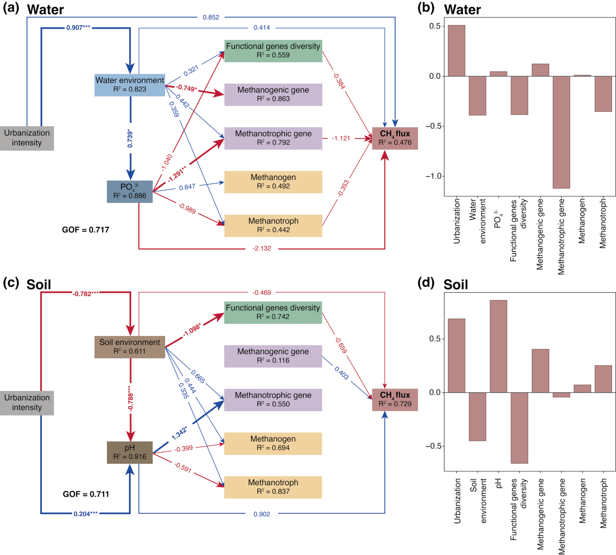 4a)水-气界面与(c)土-气界面的甲烷通量偏最小二乘路径模型(PLS-PM)。