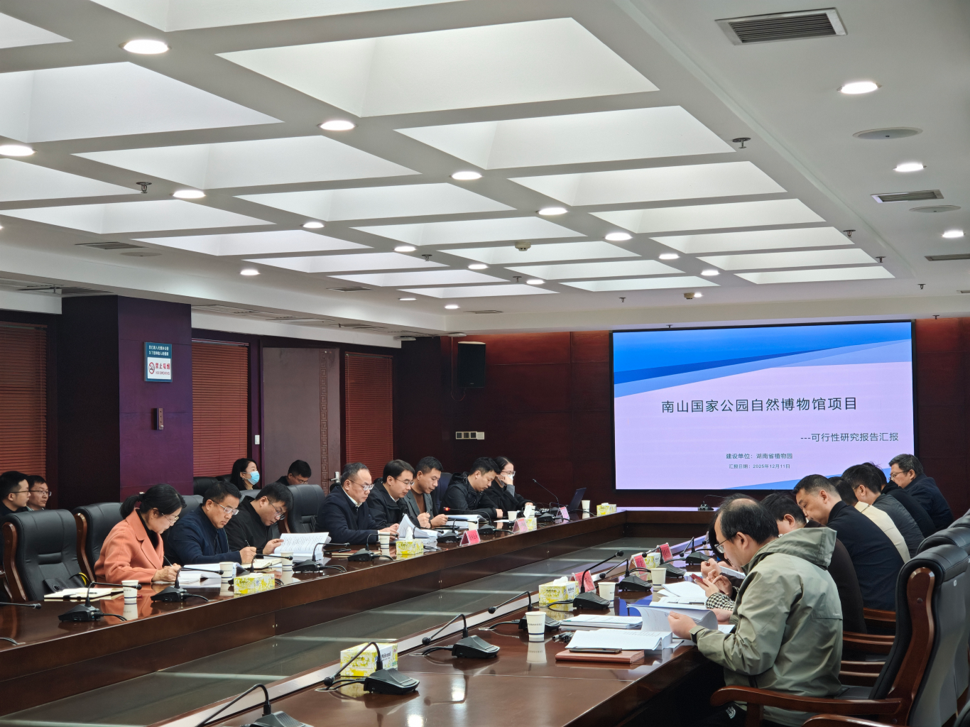 2025年12月11日上午,湖南省重点建设项目事务中心组织召开《南山国家公园自然博物馆项目可行性研究报告》(调整规模)评审会,项目总建筑面积由3万平方米调整为2.6万平方米,总投资由约3.6亿元调整至3.3亿元。省林业局总工程师李玉平,省植物园党委书记马涛,省重点建设项目事务中心副主任魏昀达等参加会议,会议邀请建筑、规划、造价、展陈等领域的七位资深专家参加评审。省发展改革委、省财政厅、省住房和城乡建设厅、省林业局、长沙市自然资源和规划局等相关主管部门代表,建设单位湖南省植物园,编制单位湖南省农林工业勘察设计研究院,设计单位湖南省建筑设计院参加会议。
