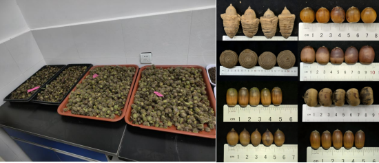 在优树选择的基础上,团队同步采集了种子与繁殖材料。对饭甑青冈、尖叶栎等树种,实施分单株采收,确保遗传信息清晰可溯。所有种子均完成规范的来源登记、形态观测与拍照记录,初步建立了种子形态数据库。此外,还从优树及不同地理种源植株上采集了健壮的接穗,为无性繁殖保存了优良的遗传资源。