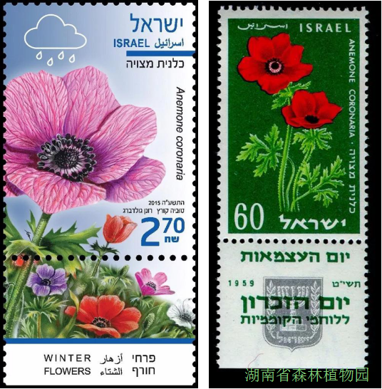 欧洲银莲花是毛茛科银莲花属多年生草本,有根状茎。叶基生,有长柄,掌状分裂,花单生于茎顶,有大红、紫红、粉、蓝、橙、白及复色,花径4厘米至10厘米(图1)。据有关资料介绍,该花世界上有200多个园艺品种。花形似莲花,花瓣有金属光泽,银莲花由此得名。以色列每年春季(1月至2月)都有“银莲花节”,以色列人称之为“Darom Adom”,意思是“the Red South”。著名的银莲花胜地Shokeda Forest(图2),大片殷红的银莲花盛开时,每年春天皆吸引大批游人前往赏花。它的身影也总出现在以色列的邮票上(图3)。它还是一种高档切花(图4),它的花语是——期待与不需回报的爱情。图片均来自网络。