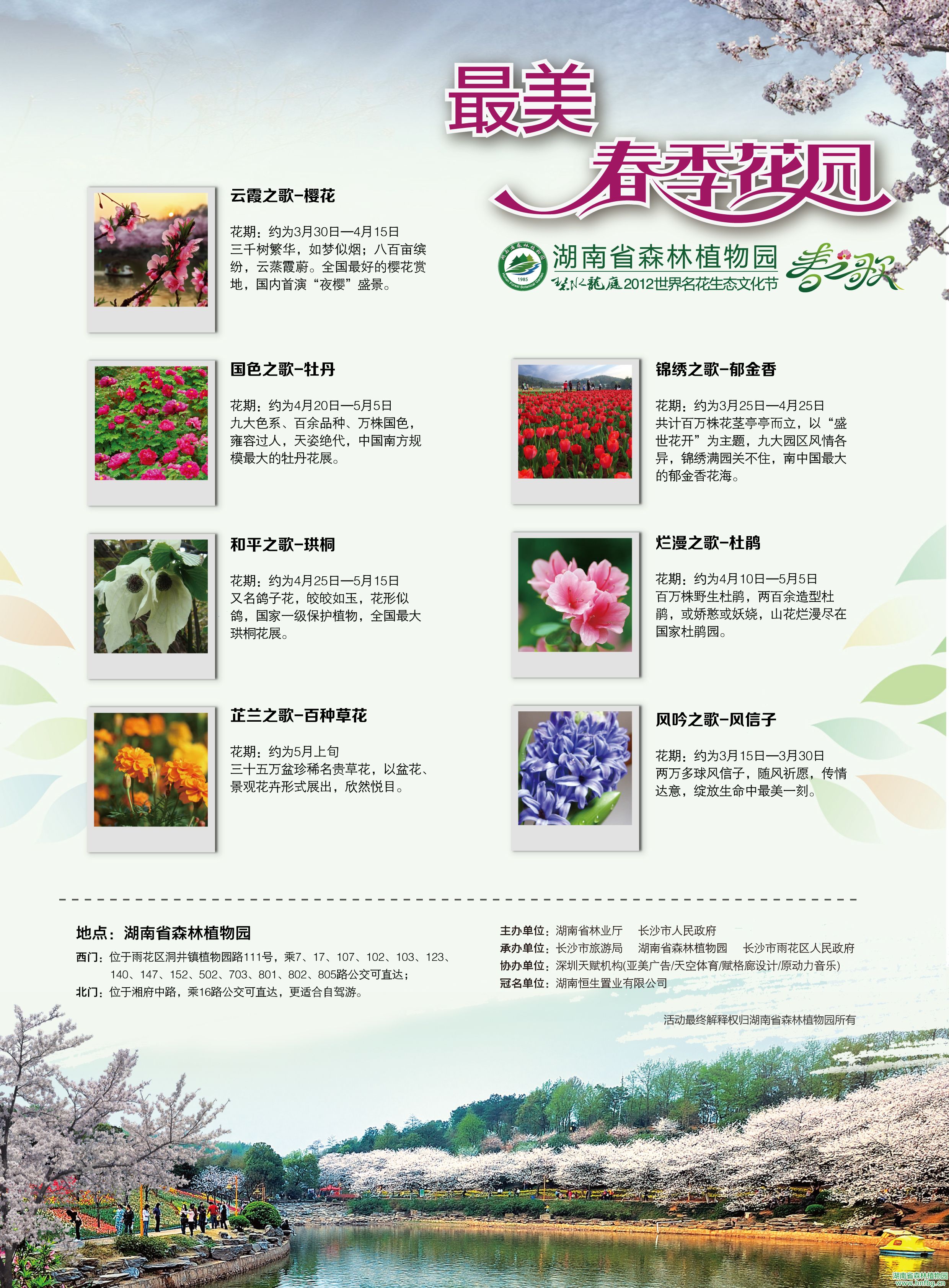2012年3月27日至5月15日(视花期待定)湖南省森林植物园以“最美的春季花园”为主题,让幸福的生活充满鲜花,打造水上百花园,举办世界名花生态文化节“春之歌”七大花展。花展期间主题活动丰富多彩,精彩纷呈!