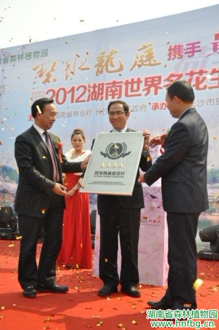 在随后举行的4A景区授牌仪式中,省旅游局规划财务处处长宣读了“全国旅游景区质量等级评定委员会2012年第一号公告”,湖南省林业厅副厅长柏方敏、湖南省旅游局纪检书记高扬先向我园党委书记王明旭授予了4A级旅游景区标牌,这标志着我园已经晋级国家4A级景区行列,也使植物园的生态旅游迈上崭新的台阶、进入新的境界,更使植物园实现了社会综合价值最大化。