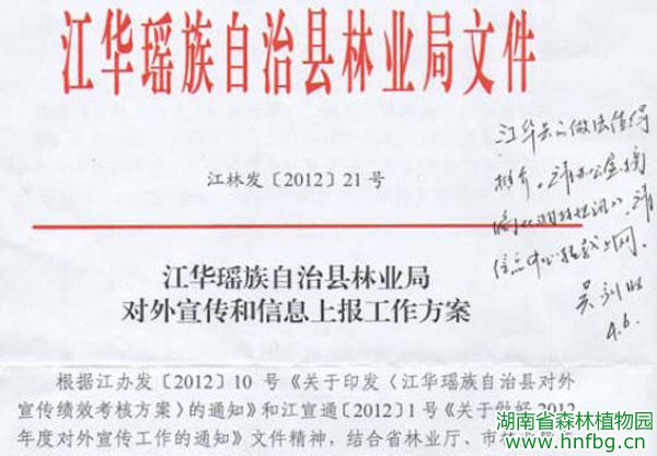 近日,为加强林业宣传和信息工作,扩大林业社会影响,树立良好社会形象,江华瑶族自治县林业局出台了《对外宣传和信息上报工作方案》。该方案措施过硬、易于操作、推动力强,值得各地学习借鉴。4月6日,省林业厅副巡视员吴剑波在《江华瑶族自治县林业局对外宣传和信息上报工作方案》(江林发[2012]21号)上批示:“江华县的做法值得推介。请办公室摘编《湘林快讯》,请信息中心转载上网”。