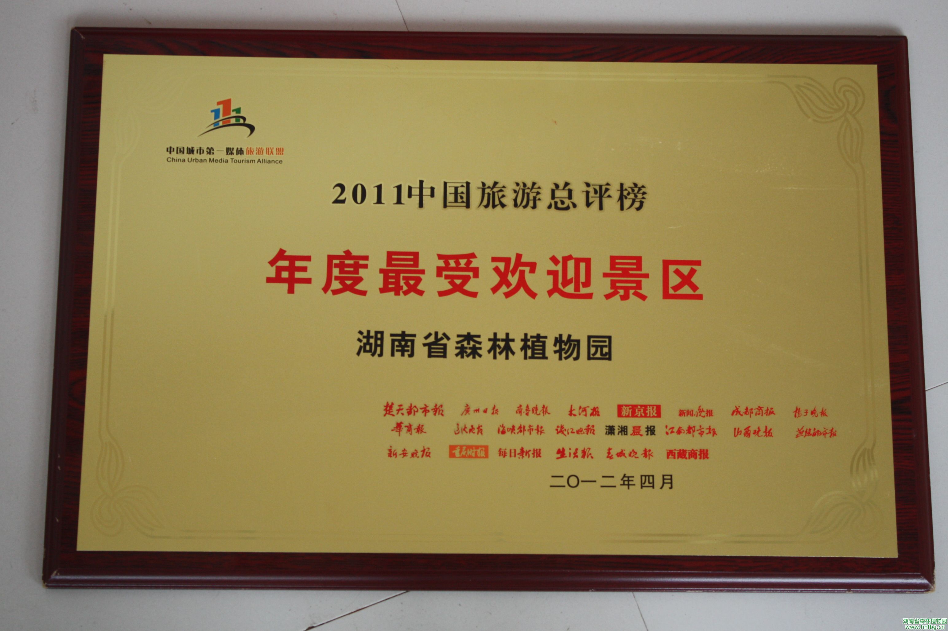 继我园荣获“2011中国(湖南)年度浪漫花海旅游胜地”称号之后,2012年4月12日中国国内旅游交会上传来捷报,被誉为旅游业界奥斯卡总评榜——“2011中国旅游总评榜”榜单揭晓,中国城市第一媒体旅游联盟包括湖南潇湘晨报、山东齐鲁晚报、湖北楚天都市报、广州日报、北京新京报、上海新闻晚报等23家国内主流媒体投票表决,湖南省森林植物园等19家景区当选为“年度最受欢迎景区”。此次活动是2011年度国内旅游界影响最大、参与范围最广、覆盖面最大的大型评选活动,将对中国旅游的开发建设、市场行销、品牌塑造等方面起到极大的推动作用。近年来,通过园林园貌提质改造、强化“湖南世界名花生态文化节”品牌建设、努力提高综合服务水平,我园旅游事业取得了突飞猛进的发展,此次荣登“2011中国旅游总评榜年度最受欢迎景区”,是社会各界对湖南省森林植物园所作努力的充分肯定,在全国范围内提升了我园的知名度和影响力,我们将以次为契机,再接再厉推动植物园的全面发展。