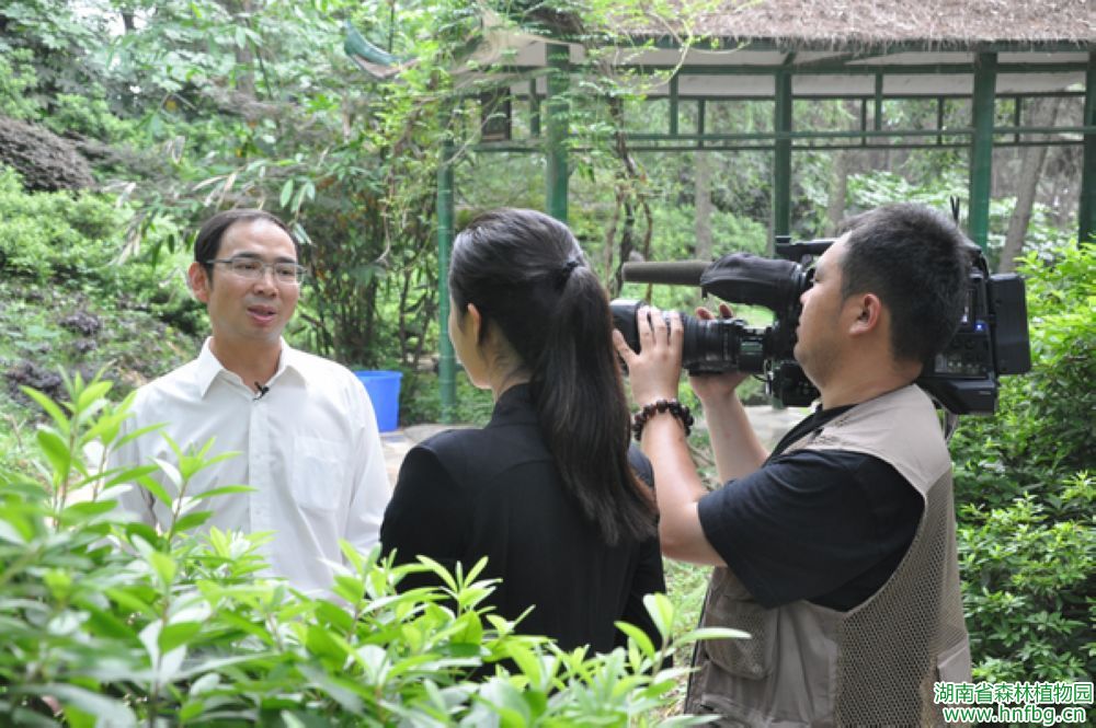 栏目组一行来到我园的珍稀濒危植物专类园、樱花园、竹园、桂花园和三湘景园,对我园身处城市中心而成功迁地保育3200种植物感到惊叹,特别是看到成功保存的银杉、南方红豆杉、沉水樟等珍贵濒危植物和绒毛皂荚等极小种群植物感到非常兴奋,他们进行了详细的拍摄。随后王明旭书记、颜立红博士和退休老同志陈桂华接受了采访。王明旭书记在接受采访时详细介绍了我园多年来在绿色湖南建设中所做出的巨大努力,作为湖南省生物多样性保护的重要平台和生态文明教育的重要基地,我园通过自身努力,为长沙森林城市建设和绿色湖南建设作出了突出贡献并提供了重要示范。