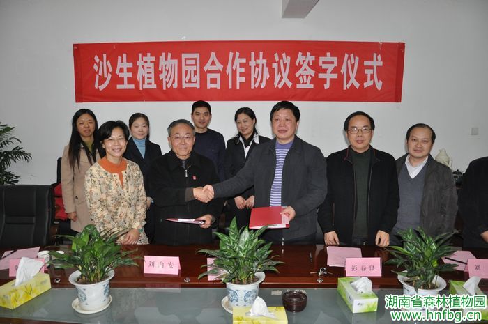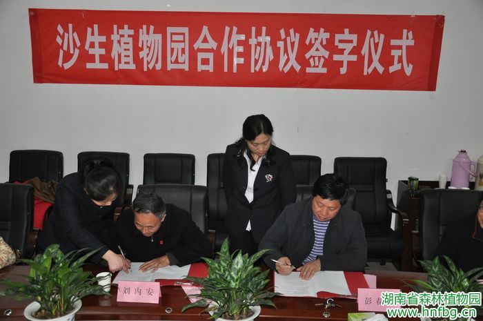 省植物园主任彭春良和刘内安先生共同签署了《沙生植物园合作协议》。省植物园副主任刘玮、刘内安先生助手雨花区城投集团党委书记陈萍女士、省植物园党政办、研发中心、旅游中心等部门有关人员以及潇湘晨报、湖南经视、湖南都市频道等媒体记者出席签字仪式。