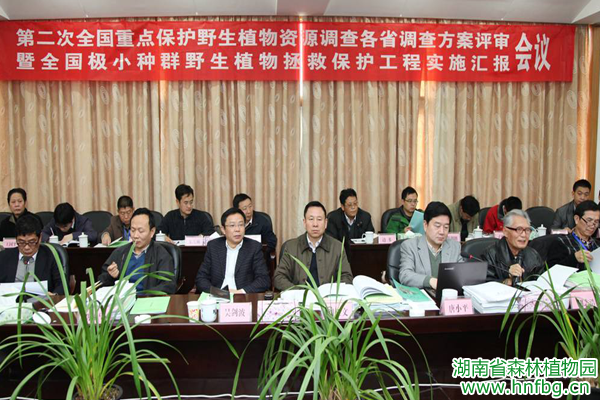 2012年11月28日-30日,由国家林业局保护司主办的第二次全国重点保护野生植物资源调查各省调查方案评审暨全国极小种群野生植物拯救保护工程实施汇报会在湖南长沙召开。国家林业局保护司刘亚文副司长出席会议并作了重要讲话,湖南省林业厅邓三龙厅长会见刘亚文副司长一行,湖南省林业厅吴剑波副巡视员出席会议并致辞。来者林业科研院所和高等院校的植物专家、各省林业行政主管部门和野生植物资源调查技术支撑单位的60余人参加了此次会议。