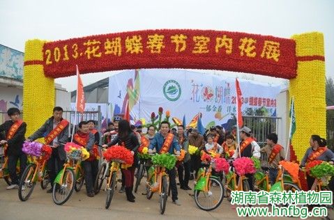 湖南世界名花生态文化节四部花曲之一的“冬之韵”2013花·蝴蝶春节花展如期而至,花展活动时间为2013年2月1日——3月8日。为了更好的宣传本次花展活动,让市民朋友能够及时了解并共享此次生态文化大餐,1月31日上午,在植物园蝴蝶温室举办了花展的新闻发布会,并以独具特色的自行车花车巡游活动为花展启幕。