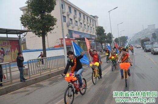 参加此次花车巡游活动的是来自长沙2所自行车俱乐部的成员以及部分市民朋友,共计50余人。活动的目的一来是向市民朋友宣传“低碳出行、绿色环保”的理念,二来是向外展示宣传本次花展的特色内容,每辆自行车都由绢花或鲜花进行装饰,骑行人员佩戴宣传口号绶带,激情饱满的骑“花车”沿湘府路、韶山路巡游,并在人流集中的雨花亭沃尔玛广场和东塘友谊广场发放植物园宣传资料千余份。