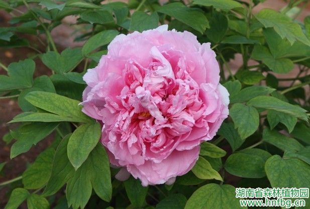 传统品种。植株偏矮,半开张。中型圆叶,叶背密生绒毛。生长势、分枝力强,成花率高,萌蘖枝多。花浅红色,荷花型,有时呈托桂型。花径14cm×8cm。花瓣3~4轮,宽大圆整,基部紫色晕;雄蕊偶有瓣化,雌蕊正常。花期中。