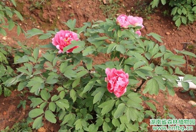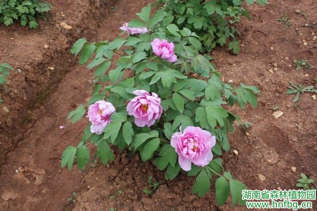 植株高大半开张。中型长叶,背面叶脉处有短绒毛。生长势强,成花率高,分枝力强,萌蘖枝多。花粉色,皇冠型。花径15cm×5cm。外瓣2轮,质厚,端部有齿裂,基部具粉红色晕,内瓣曲皱,端部残留花药,瓣间杂有少量雄蕊;雌蕊瓣化成绿色彩瓣。花期中。