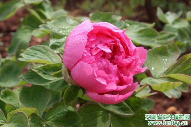 传统品种。植株高大直立。中型圆叶,小叶短肥,阔卯圆形,淡绿色具光泽,叶背有柔毛,常交叉重叠,十分奇特。其生长势强,成花率高,花色艳丽,花型端庄。花深桃红色,盛开微显紫色,千层台阁型,有时呈菊花型。花径20cm×8cm。下方花外大瓣4~5轮,瓣基具紫斑,内花瓣碎小且密;上方花花瓣增大竖起,雄蕊多正常,花丝紫红色,花心紫红色。花期中。