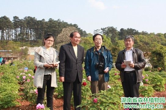 成仿云教授、洛阳牡丹专家李耀进及我园技术人员在现场进行了深入的交流的探讨,成教授对多个牡丹品种在我园及在原引种地洛阳的生长情况进行了对比,认为在花型、花径、花色、生长势及各种抗性都存在差异或发生了变化,并分析了原因,提出了下步的管理措施。成教授充分肯定了我园牡丹园的栽培与研究,肯定了一批优良的中原牡丹品种可以在南方高湿热地区良好生长。针对克服中原牡丹南移所存在的普遍问题及发展湖南本土牡丹产业,成教授提出了很多建设性的建议。
