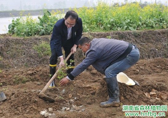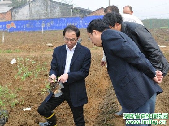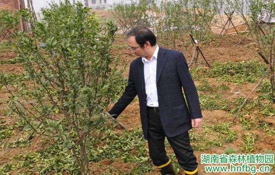 4月2日,园党委书记王明旭在园副主任刘玮和共建处负责人陪同下,到东湖塘基地检查指导竹类、蜜源植物和蓝莓苗木种植工作。