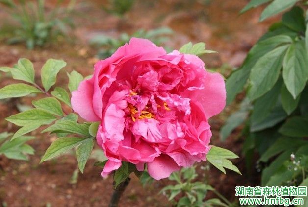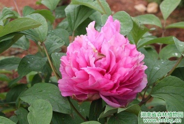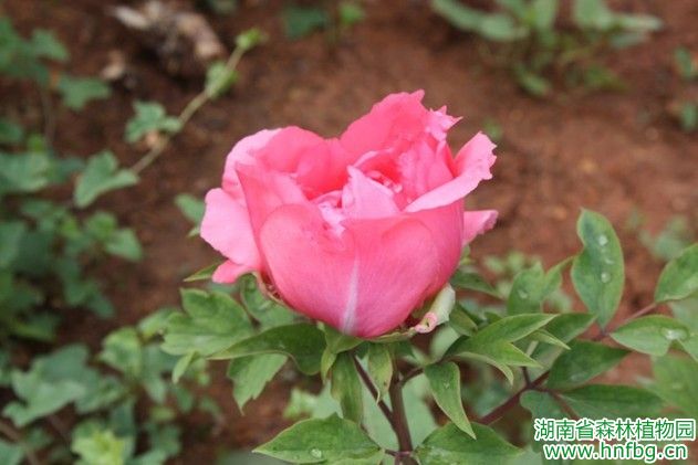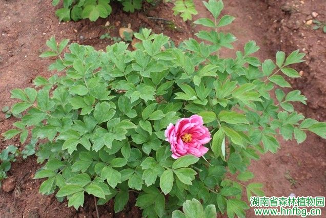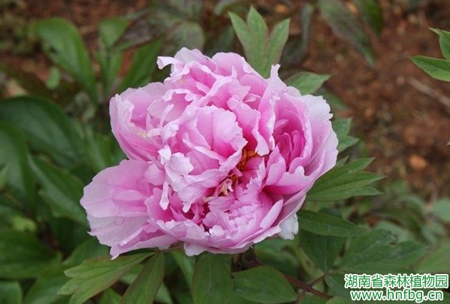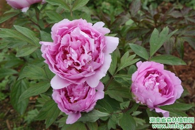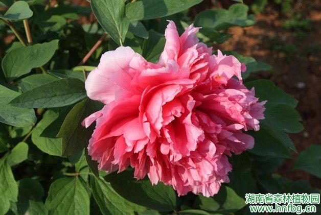 传统品种。植株高大开张。大型长叶,缺刻少,端渐尖,叶面粗糙,深绿色。生长势强。花粉红色,楼子台阁型。花梗短,侧开。下方花外瓣2轮,较平展,内瓣皱褶紧密;雄蕊完全瓣化,雌蕊瓣化为绿色彩瓣;上方花花瓣较少,稍大而皱褶。