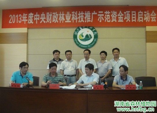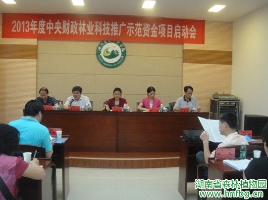 2013年6月27日,湖南省“2013年度中央财政林业科技推广示范资金项目启动会”在省林科院举行。厅党组成员、总工程师文振军到会并做重要讲话。植物园彭春良主任、刘玮副主任和科管处、研发中心负责人及植物园项目协作单位望城区林业局、南岭植物园的相关负责人参加了会议。
